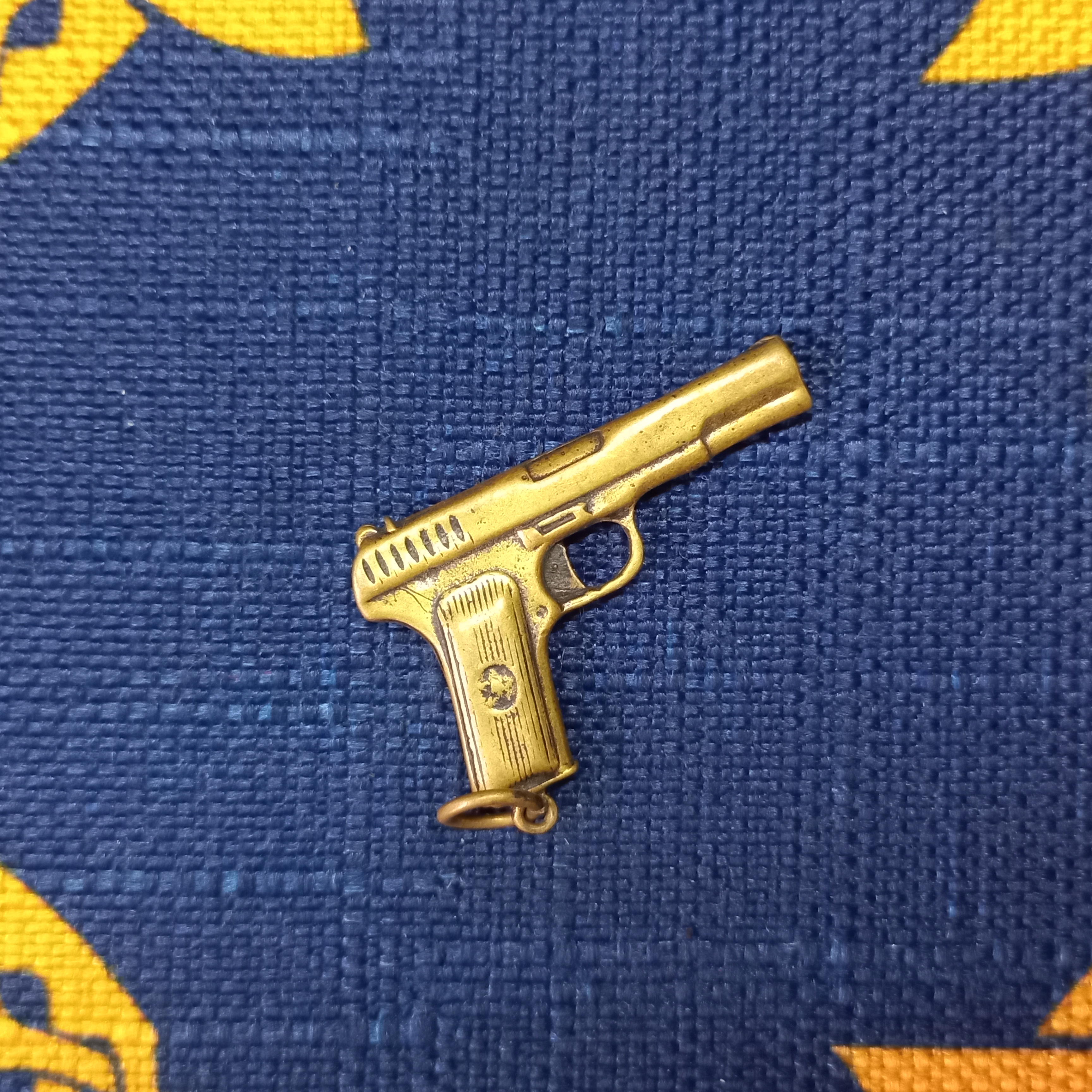 Подвеска выполнена в виде точной копии пистолета ТТ, что придает ей особую изюминку. Материал изготовления — бронза, покрытая чернением для долговечности и эстетики.