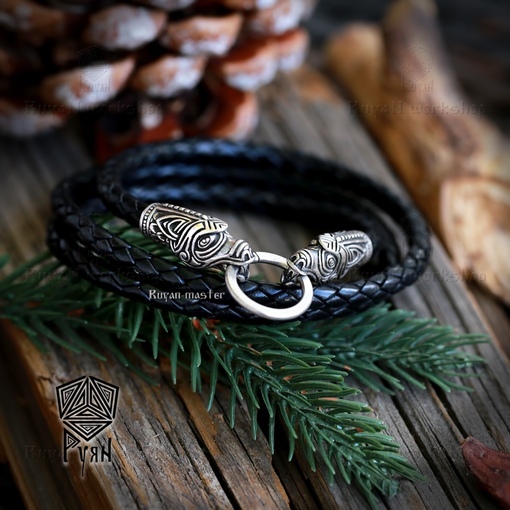 Кожа, серебро. Диаметр 5 мм. Головы являются замками и браслет, при желании, может стать шнуром или браслетом. Стоимость указана без учета стоимости бусин.